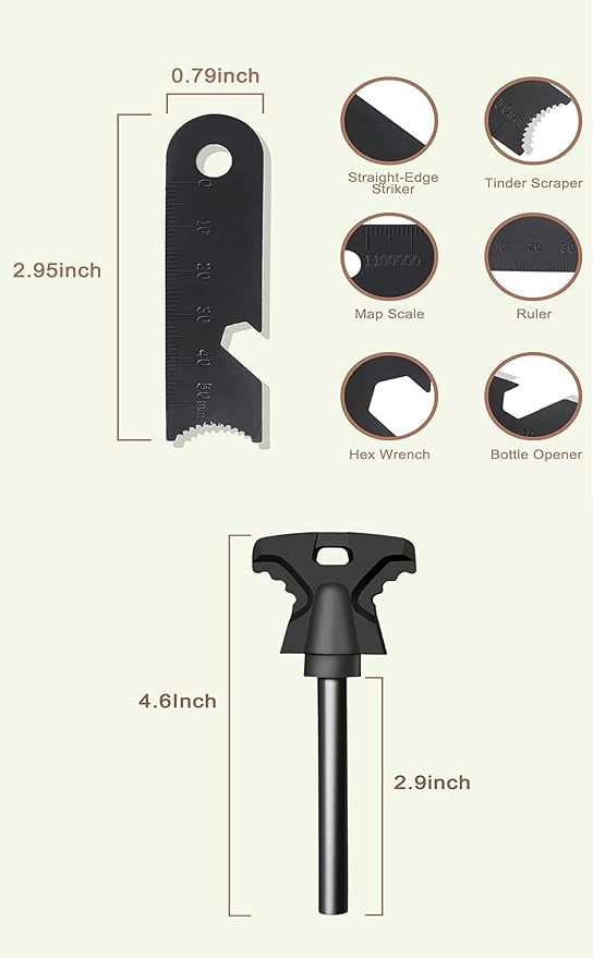 Le paquet comprend une tige d'allume-feu, une corde, un grattoir intégré avec ouvre-bouteille et une règle.
